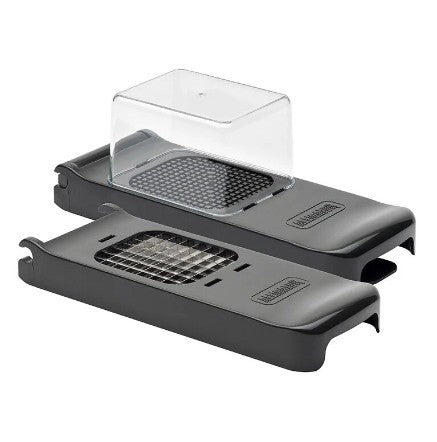 You’ll get the Chopper base, two interchangeable multi-knife cutting grids (the chopper and the chipper), a standard-sized, clever BPA-free food collection trap. Cutting knife grid (Chipper) with 12x12 mm (1/2") grid squares for chopping thicker items such as potatoes for French fries. Cutting knife grid (Chopper) with 6x6 mm (1/4") grid squares for chopping items such as onions and vegetables. The interchangeable cutting guides and the food collector cleverly keep what is chopped in one spot. Perfect for cutting onions, garlic, fruit, and vegetables. Easy to clean up with the quickly-removed cleaning grid inserts that lift away any scraps. Dishwasher Safe. 2-year function warranty (blades and collector box). 10-year material warranty (plastic body).