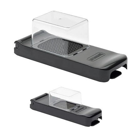 The Alligator Chopper & Mini Chopper Set, Black Edition, combines our most popular Alligator products in one box. Each set contains: 1 x Alligator Chopper with Collector. 1 x Alligator Mini Chopper with Collector Alligator chopper cuts sticks and cubes measuring 6 mm x 6 mm. Collectors cleverly place what is chopped in one spot. Alligator mini chopper cuts sticks and cubes measuring 3 mm x 3 mm. Dishwasher Safe. 2-year function warranty (blades and collector box). 10-year material warranty (plastic body).