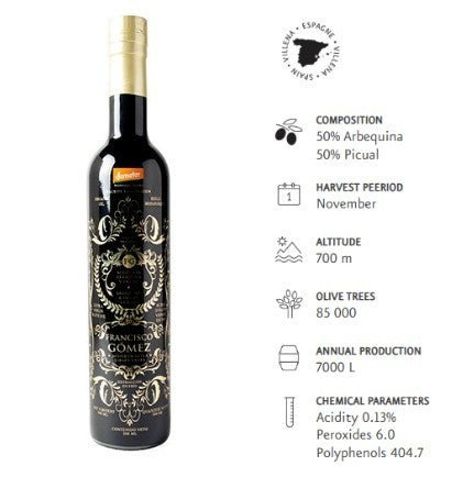 The oil is made from the first olives of the varieties called Aberquina (50%) and Picual (50%).